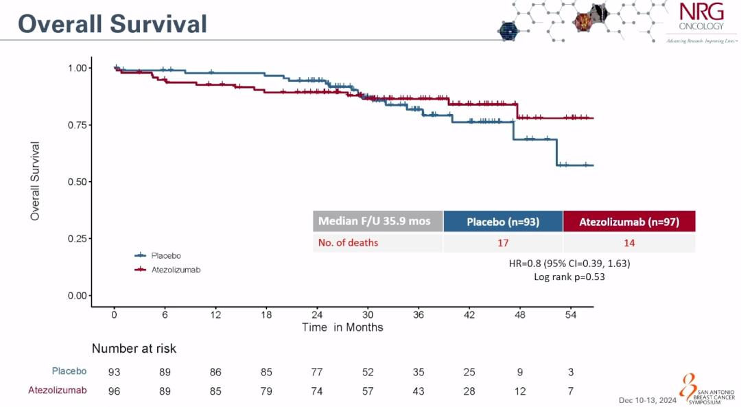 由于阿替利珠单抗组的死亡人数不平衡,且持续缓慢累积,因此BR004研究于2022年4月提前终止。研究组停止了阿替利珠单抗/安慰剂治疗,继续接受非盲态THP方案标准治疗。随访结果显示,两组的3/4级事件发生率无显著差异,且阿替利珠单抗未损失THP的疗效。中位随访31.9个月,阿替利珠单抗组尽管存在数值上的优势,但由于样本量较小且OS尚不成熟,尚无法确定增加阿替利珠单抗是否能带来额外获益。总之,尽管BR004的结果不支持将阿替利珠单抗加用至THP方案中,但该研究发现支持了在HER2阳性mBC患者中免疫检查点抑制剂结合ADCs的潜在联合价值。