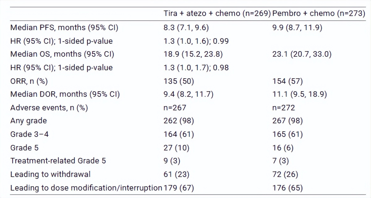 在数据截止时,Tiragolumab+阿替利珠单抗+化疗组的疗效低于标准疗法,中位PFS分别为8.3个月vs 9.9个月(风险比<hr/>=1.27;95%置信区间[CI]:1.02-1.57;P=0.99),OS分别为18.9个月vs.23.1个月(HR=1.33;95%CI:1.02-1.73;P=0.98)(表)。亚组分析观察到的结果一致,包括PD-L1亚组。