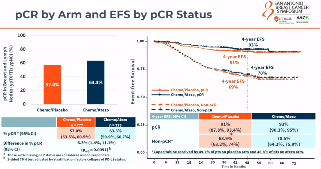 And so half of our non-pCR patients got Capecitabine.So there are differences in the patient populations that came into the study.There’s also differences in the therapy that I think will be of interest,you know,doing the cross trial comparisons.Bottom line to our study was that we did not meet our primary endpoint.We did not show that adding atezolizumab to standard chemotherapy resulted in a statistically significant improvement in event-free survival.So we have to consider our study negative for the goal of showing clear superiority.However,when we look at our subsets,we did see our node-positive patients seem to benefit.