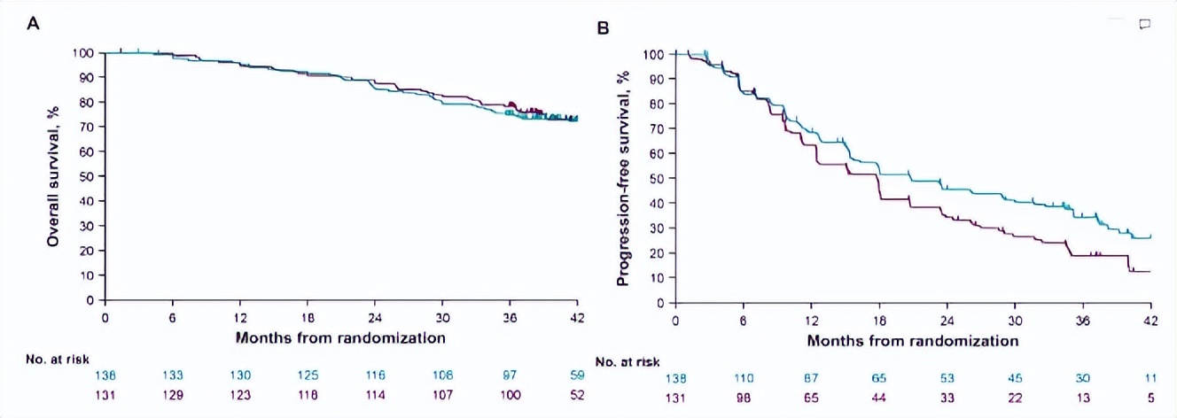 KEYNOTE 426研究低危患者OS(A)和PFS(B)生存曲线图