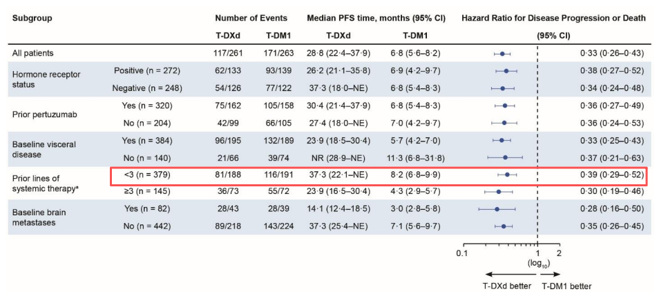 [2]Hurvitz SA,Hegg R,Chung WP,et al.Trastuzumab deruxtecan versus trastuzumab emtansine in patients with HER2-positive metastatic breast cancer:updated results from DESTINY-Breast03,a randomised,open-label,phase 3 trial.Lancet.2023;401(10371):105-117.doi:10.1016/S0140-6736(22)02420-5
