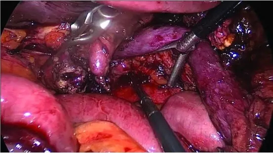 图2.腹腔镜胰十二指肠切除术术中观察胰腺及肠系膜上动静脉的腹膜后解剖