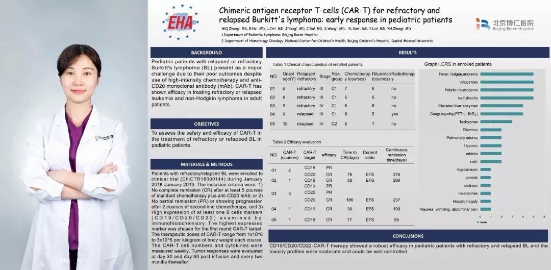 在本届大会上,北京博仁医院张文群医生代表团队报道了题目为“嵌合抗原受体T细胞(CAR-T)治疗难治和复发性伯基特淋巴瘤:儿童患者的早期反应”(Chimeric antigen receptor T-cells (CAR-T) for refractory and relapsed Burkitt’s lymphoma: early response in pediatric patients )的最新研究成果。