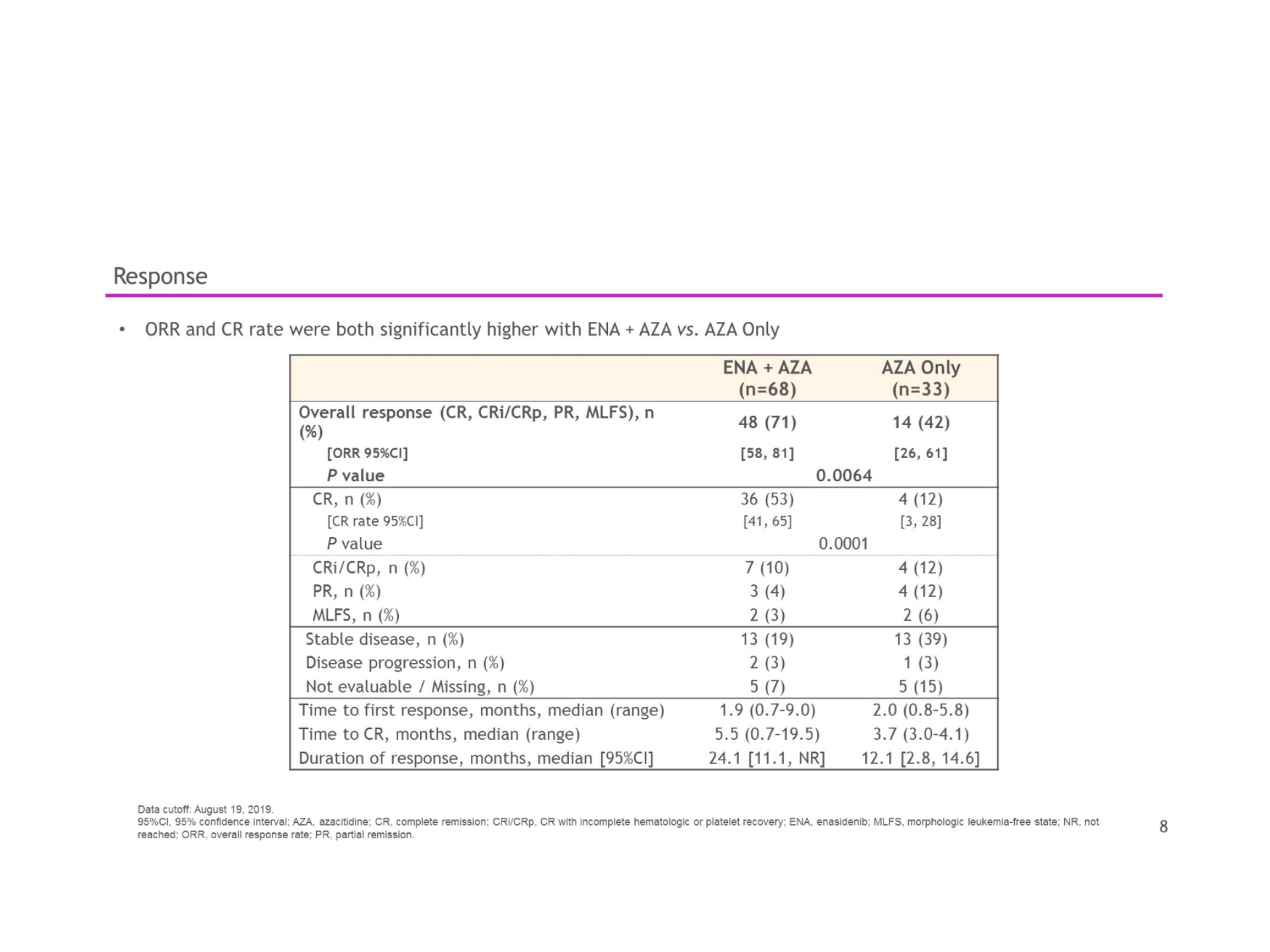 结论:ENA联合AZA能够显著改善mIDH2 ND-AML患者的治疗反应以及反应持续时间,并且在老年患者中耐受性良好。后续治疗对OS和EFS以及新转化数据的影响将在会议中呈现。(临床试验注册号:NCT02677922)。