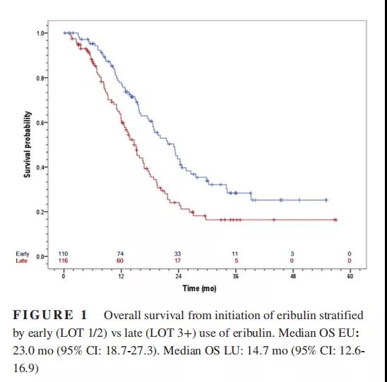 对226例患者(89.6%)进行生存分析的结果显示,对于EU组患者,从艾立布林治疗开始的中位OS为23.0个月(95%CI:18.7~27.3);对于LU组患者,从艾立布林治疗开始的中位OS为14.7个月(95%CI:12.6~16.9)。在真实世界中,用艾立布林治疗的mTNBC中,患者具有更多的其他部位转移性疾病,并且接触了更多的治疗。研究证实,三线或更晚患者中位OS仍能达到14.7个月,并且长于EMBRACE和Study-301研究中分别报告的13.1个月和14.4个月。此外,一线或二线使用艾立布林可以使患者的中位OS长达23.0个月,可以得出对于mTNBC患者来说,越早应用艾立布林患者总生存更长,获益更久。