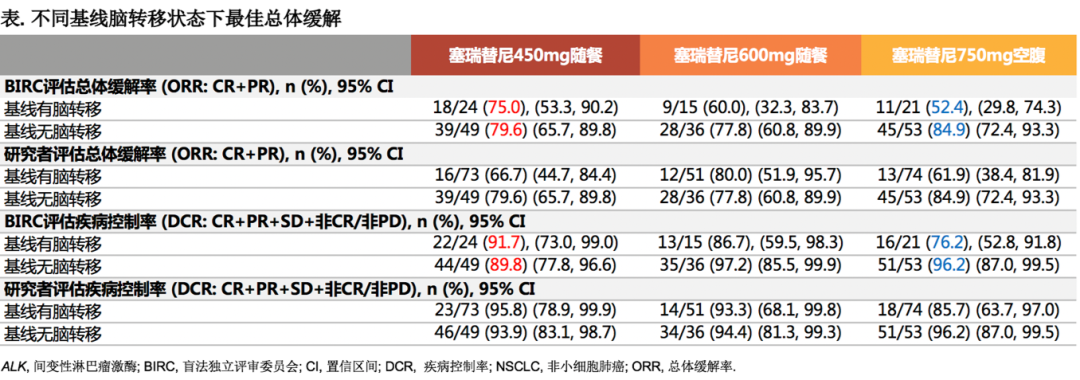 在此次WCLC大会上,塞瑞替尼ASCEND-8研究首次公布了一线治疗基线有脑转移患者的数据。数据显示,BIRC评估下450mg随餐组的ORR达到75%,DCR高达91.7%,疗效确切!(表2)