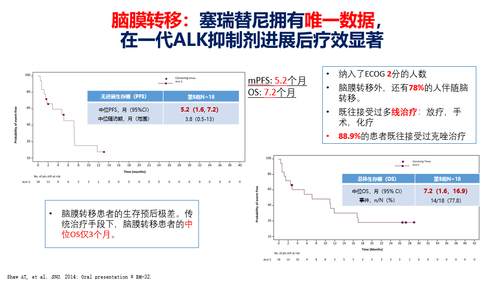 • 第5组:纳入的患者全为脑膜转移患者,88.9%的患者既往经过克唑替尼治疗后进展,经塞瑞替尼治疗后患者中位PFS达到5.2个月,中位OS达到7.2个月。作为唯一拥有脑膜转移治疗数据的ALKi,塞瑞替尼疗效显著!引用吴一龙教授在ESMO上对此研究进行点评:对脑膜转移能够达到20%的疗效,是一个惊艳结果!未来对于初始伴有或在治疗过程出现脑膜转移的患者,可考虑将塞瑞替尼作为首选治疗!