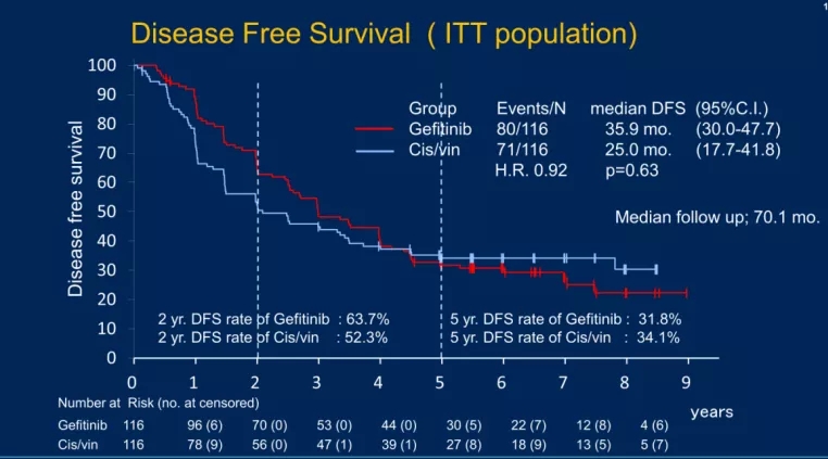 吉非替尼组的中位DFS数值似乎更好,分别为35.9个月(95% CI: 30.0-47.7)和25.0个月(95% CI: 17.7-41.8) (HR=0.92; 95% CI: 0.67-1.28; P=0.63);然而,2年和5年DFS率无显著差异。具体来说,吉非替尼的2年DFS率为63.7%,而顺铂/长春瑞滨的2年DFS率为52.3%;5年DFS率分别为31.8%和34.1%;