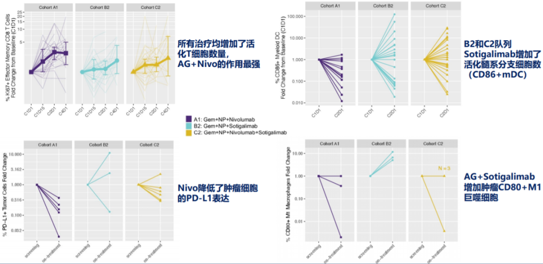 药效学作用数据显示,A1、B2和C2组治疗方案均增加了患者的活化效应记忆性(EM)T细胞数量,其中队列A1的化疗+纳武利尤单抗作用最强,B2和C2队列中大多数患者活化髓样树突状细胞(CD86+mDC)数量增加,为Sotigalimab预期的药效学作用,且Sotigalimab+化疗(队列B2)中CD80+ M1巨噬细胞数量增加;而队列A1中CD86+mDC数量有所减少,表达PD-L1的肿瘤细胞比例减少,具体如图4所示。