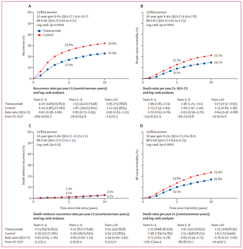 与单独化疗相比,曲妥珠单抗+化疗患者的10年复发率降低9.0%(95%CI:7.4~10.7;P<0.0001),10年乳腺癌死亡率降低6.4%(95%CI:4.9-7.8;P<0.0001),全因死亡率降低6.5%(95%CI:5.0-8.0;P<0.0001),非复发死亡率无增加(绝对值为0.4%,95%CI:-0.3~-1.1;P=0.35)。