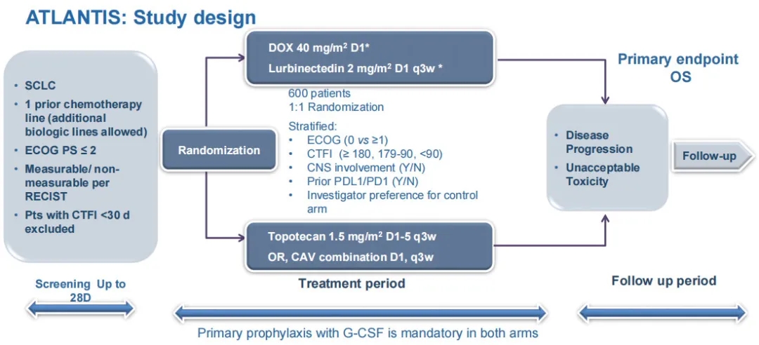 因此,研究人员启动了III期ATLANTIS研究对比该组合与现有标准方案。符合入选条件的患者必须确诊为SCLC并接受过1次既往化疗,ECOG体能状态评分≤2,有RECIST标准可测量的病灶,CTFI<30天的患者被排除在外。共600名患者以1:1的比例分组,随机接受推荐剂量的鲁比卡丁+多柔比星,或接受拓扑替康1.5 mg/m2治疗(每3周一周期,第1~5天给药)或CAV(每3周一周期,第1天给药)。两组都必须使用粒细胞集落刺激因子进行初级预防。治疗直至疾病进展或出现无法耐受的毒性。患者按ECOG体能状态(0vs≥1)、CTFI(≥180、179-190、<90)、中枢神经系统受累(是vs否)、既往PD-L1/PD-1药物治疗(是vs否),以及对照组的研究者偏好进行分层。该研究的主要终点是OS。
