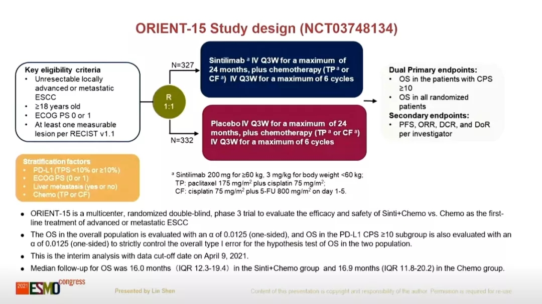 3. Shen L. Sintilimab plus chemotherapy versus chemotherapy as first-line therapy in patients with advanced or metastatic esophageal squamous cell cancer: First Results of the Phase 3 ORIENT-15 study. ESMO Congress 2021, Abstract LBA52