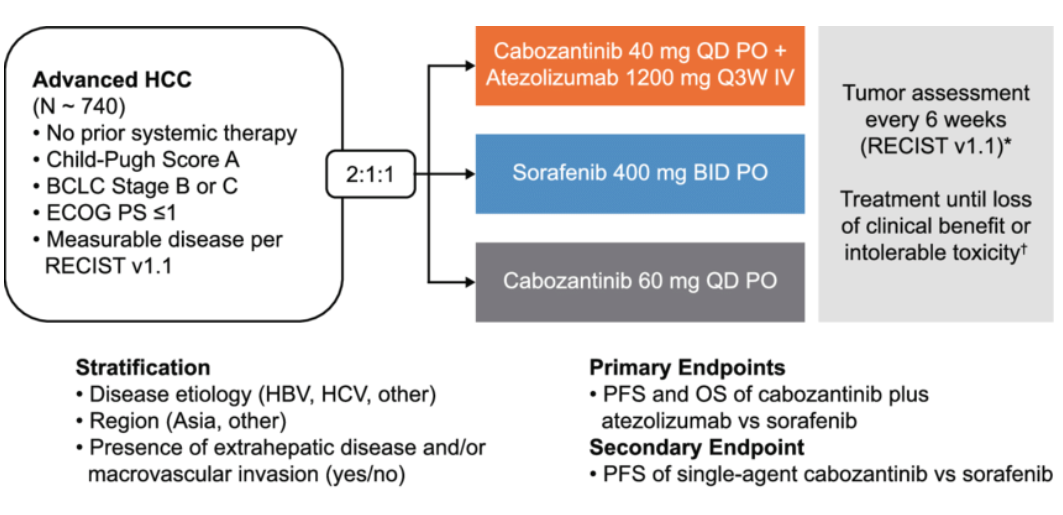 主要终点为C+A组的PFS和OS,次要终点为单药C对比单药S的PFS。研究的分层因素包括病因(HBV、HCV和其他)、地区(亚洲和其他)、是否有肝外疾病和/或微血管侵犯等。