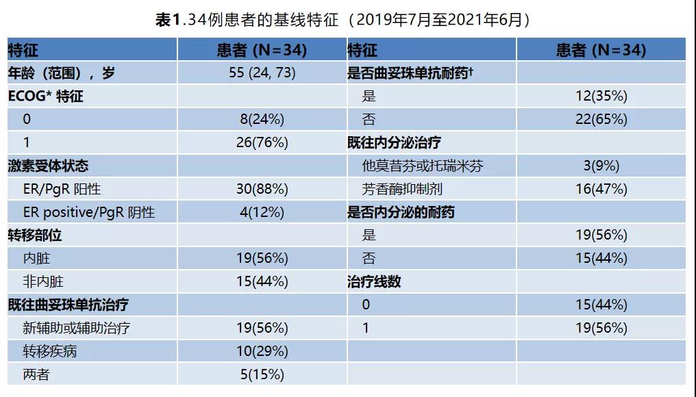 如表1所示,在入组的34例患者中,平均年龄为55岁,大部分(88%)患者为三阳性(ER+/PR+/HER2+);有19例(56%)患者存在内脏转移疾病;有24例(71%)患者在(新)辅助治疗阶段使用过曲妥珠单抗;12例(35%)患者为曲妥珠单抗耐药;16例(47%)患者使用过AI,19例(56%)患者为内分泌耐药。