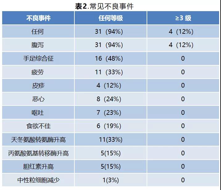在有可用安全数据的患者中,最常见的治疗相关不良事件是腹泻(94%)、手足综合征(48%)、疲劳(33%)和AST升高(33%);仅有4例(12%)患者发生≥3级的腹泻,没有其他≥3级的AE,也没有患者因不良事件而停止治疗。由于随访时间少于6个月,因此有1例患者未参加安全性评估。