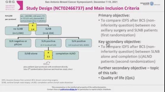背景:既往NSABP-04研究证实不需要腋窝手术处理也能达到较好的局控,近年SLNB在部分人群中能够取代ALND。尽管越来越多的证据表明ALND不适合用于局部区域控制,但仍被乳腺癌治疗指南推荐。为了重新评估标准局部治疗,INSEMA试验设计在临床淋巴结阴性的早期乳腺癌患者中,验证无腋窝手术与SLNB或完全ALND手术在主要研究终点iDFS的非劣效性,QOL为次要研究终点之一。