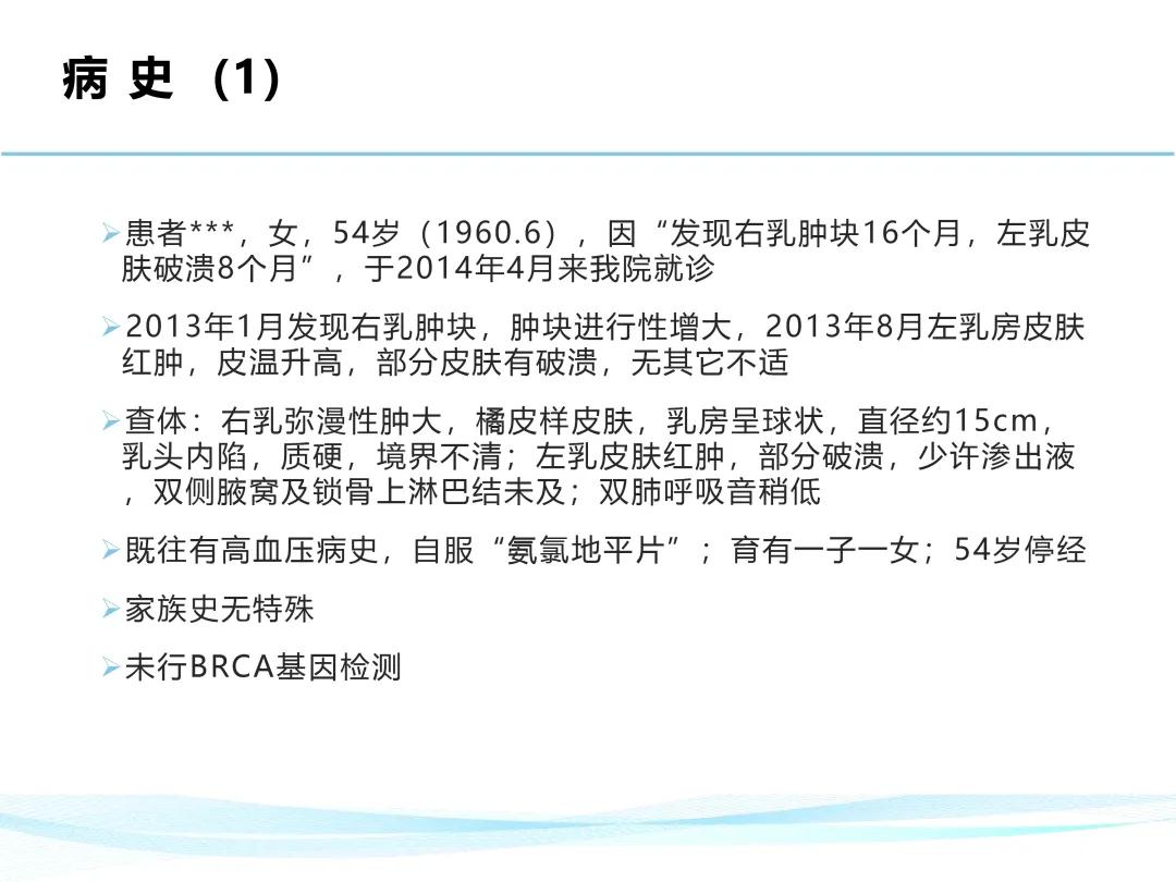 患者就诊时发现双侧乳腺癌,需要鉴别是双侧原发乳腺癌,或是一侧为原发而另一侧为转移癌,可以通过是否有原位癌成分、病理类型、分子分型、有无远处转移等加以鉴别,尤其对于无远处转移的患者明确双侧原发乳腺癌对局部治疗策略的考虑至关重要。该患者当时的病理未提及原位癌信息,术后病理显示相同的病理类型及分子分型,尤其在就诊时已为晚期乳腺癌,因此考虑一侧为原发乳癌,另一侧转移癌可能性更大。患者已出现双侧乳房皮肤病变、远处多发淋巴结肿大、双侧胸腔积液,手术等局部治疗无法改善患者生存,不作为常规治疗方法。但对于乳房局部有破溃的患者,姑息性的乳腺局部切除或可在一定程度上改善患者的生活质量,加之患者强烈要求,手术治疗也不失为一种可以考虑的治疗。