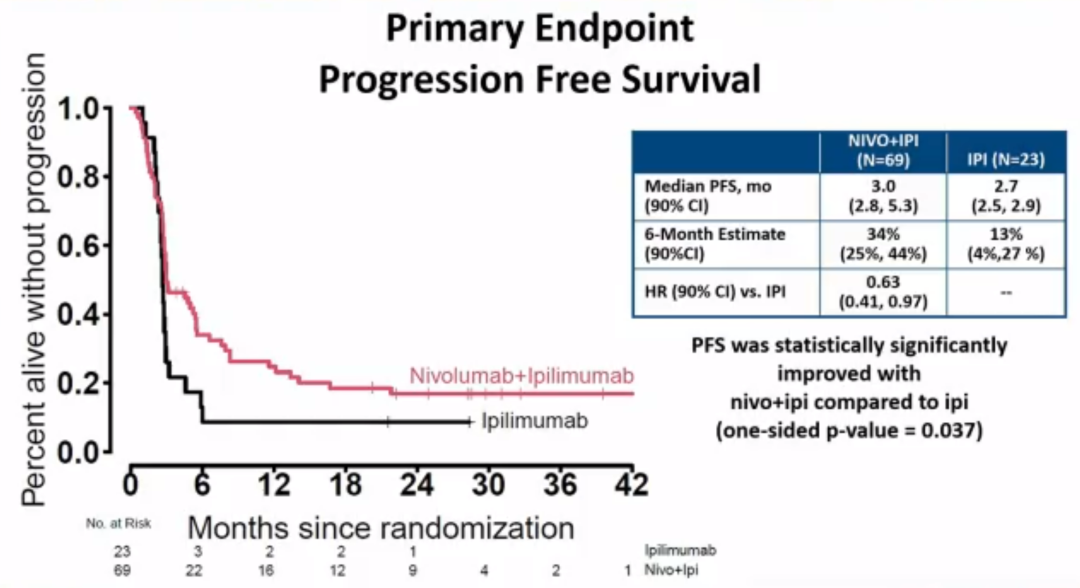 结果显示,中位随访25.3个月,Ipi/Nivo组和Ipi组的中位PFS分别为3.0个月和2.7个月(HR 0.63,90%CI:0.41~0.97,P=0.037),6个月PFS率分别为34%(90%CI:25%~44%)和13%(4%~27%);联合组和单药组的ORR分别为28%(95%CI:17%~40%)和9%(95%CI:3%~34%)。中位随访时间24.4个月,Ipi/Nivo组和Ipi组分别有39/69例和12/23例患者死亡,12个月OS率分别为63%(90%CI:52%~72%)和57%(38%~71%),两组患者OS无显著差异(HR 0.94,90%CI:0.54~1.62,P=0.42)。