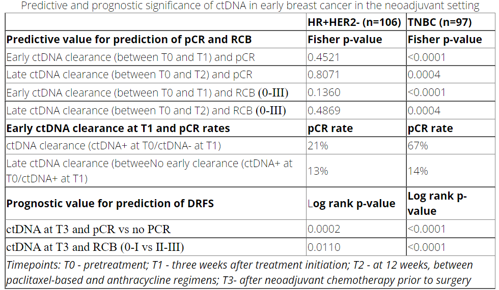 方法:采集106例HR+/HER2-和97例TNBC患者在治疗前(T0)、治疗期间(T1为治疗第3周,T2为治疗第12周)和NAC后(T3为治疗第24周)的血样。血浆样本(n=734)采用基于肿瘤的个体化mPCR-NGS ctDNA检测(SignateraTM)进行分析。这些患者都是MammaPrint术后复发的高危患者,他们接受了以紫杉类为基础的治疗+/-实验性治疗,序贯蒽环类药物。中位随访时间为3年(0.5至6.5)。检测不同时间点的ctDNA动态和状态的预测和预后价值。我们的分析是探索性的,不考虑其他生物标志物。