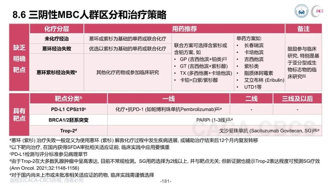 首先对于晚期TNBC患者,需要确认是否具有可治疗的靶点,如果患者缺乏明确的可治疗靶点,那么需要根据化疗分层来开展不同的治疗。