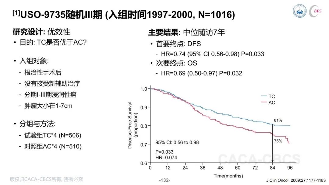 CBCS指南关于TC方案的推荐主要是基于USO-9735研究。USO-9735研究回答了TC方案是否优效于AC方案,该研究取得了优效性的阳性结果,此项研究也奠定了紫杉类药物在乳腺癌中的治疗地位。