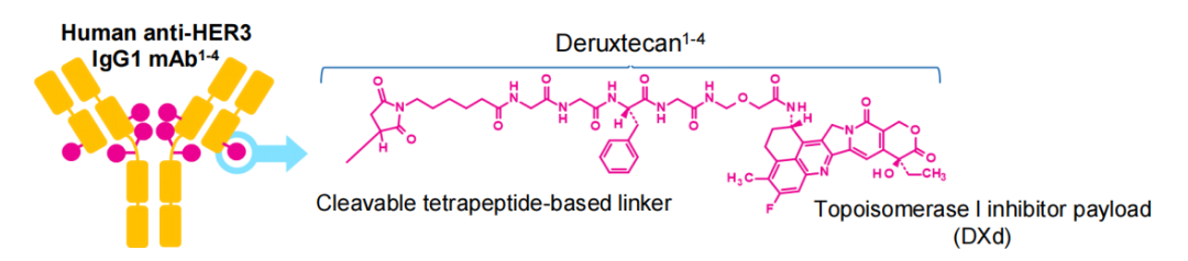 研究背景:Patritumab deruxtecan(HER3-DXd;U3-1402)是一种新型的HER3靶向ADC药物,其抗体部分为Patritumab,是一种针对HER3胞外结构域的单克隆抗体,其可以有效的阻止HER2/HER3异源二聚体形成。HER3-DXd的载药部分同T-DXd,Dato-DXd一致,为Patritumab与拓扑异构酶Ⅰ抑制剂通过共价连接所形成。
