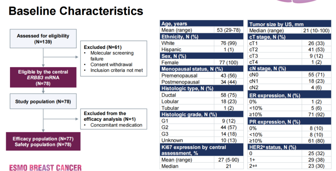 次要研究终点包括:C1D21时临床评估的客观缓解率(ORR);根据基线ERBB3 mRNA和HER3 IHC基础蛋白表达水平改变的CelTIL评分;67基因在基线和治疗后肿瘤样本间的差异表达和Ki67的变化;安全性和耐受性。