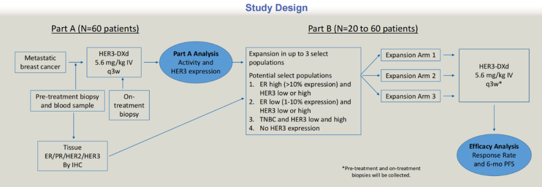 研究设计:该研究将纳入120例晚期或局部进展的HER2-乳腺癌患者,并将其分为两部分(A、B)。入组患者年龄≥18岁,且根据RECIST v1.1标准有可测量的肿瘤,ECOG PS为0-1。三阴性乳腺癌患者允许接受1-3线化疗。激素受体阳性(HR+)患者既往必须接受过内分泌治疗(ET)+CDK4/6抑制剂,对既往ET药物没有限制;且所有患者只允许既往0-2线化疗。若患者既往使用过抗HER3靶向药物治疗,则被排除。