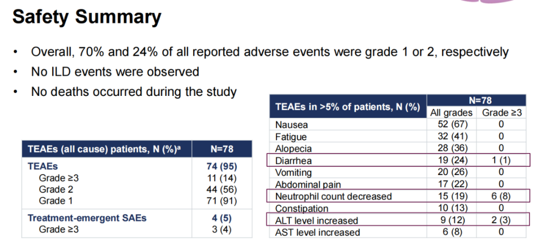 在安全性方面,74例(95%)患者报告了任何级别的AEs。最常见的3-4级AEs为:中性粒细胞减少(n=6)、ALT升高(n=2)和腹泻(n=1)。