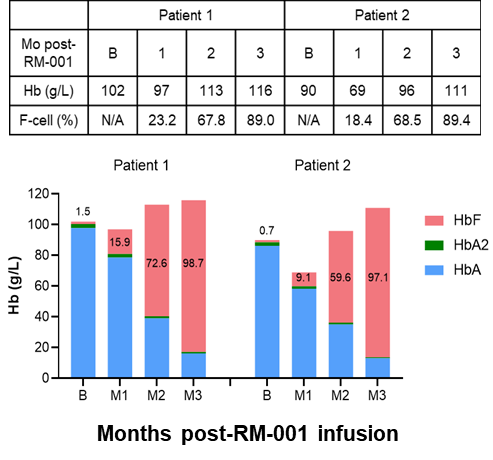 The first 2 patients treated with RM-001 demonstrated successful engraftment and both have been transfusion free within two month. Although both patients have β0/β0 genotype, they ceased pRBC transfusions within 1 month after RM-001 infusion and remained transfusion-free through the reported period. This is the first-in-human study of autologous HBG1/2 promoter-modified CD34+ HSPCs (RM-001) in TDT and both patients were treated successfully without SAE. Our studies provide novel and initial clinical evidence supporting the safety and efficacy of RM-001 for treating TDT.