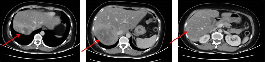 2013年6月30日腹部CT:肝右后叶病灶并肝内多发子灶,考虑M,病灶总范围8.0*5.8cm,其病灶周围可见多发异常廓清子灶(4-5个),最大约1.6cm;