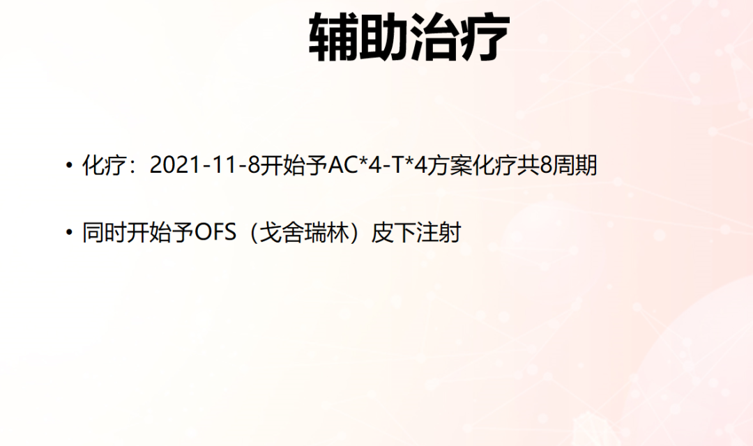 裴静教授:我认为该患者如果能在进行良好的沟通后接受新辅助治疗是更好的,因为该患者有14枚淋巴结转移(N3),术后需要进行放疗,放疗后如果进行假体植入,在包膜挛缩和乳腺外形方面都值得推敲。该患者淋巴结转移数量较多,因此进行强化治疗是非常重要的。由于该病例中患者为年轻女性,根据SOFT&TEXT研究,使用OFS联合AI是一个标准的治疗方案。另一方面,由于该患者淋巴结转移数大于4枚,根据Monarch E研究提示,加上CDK4/6抑制剂进行强化治疗是非常合适的。