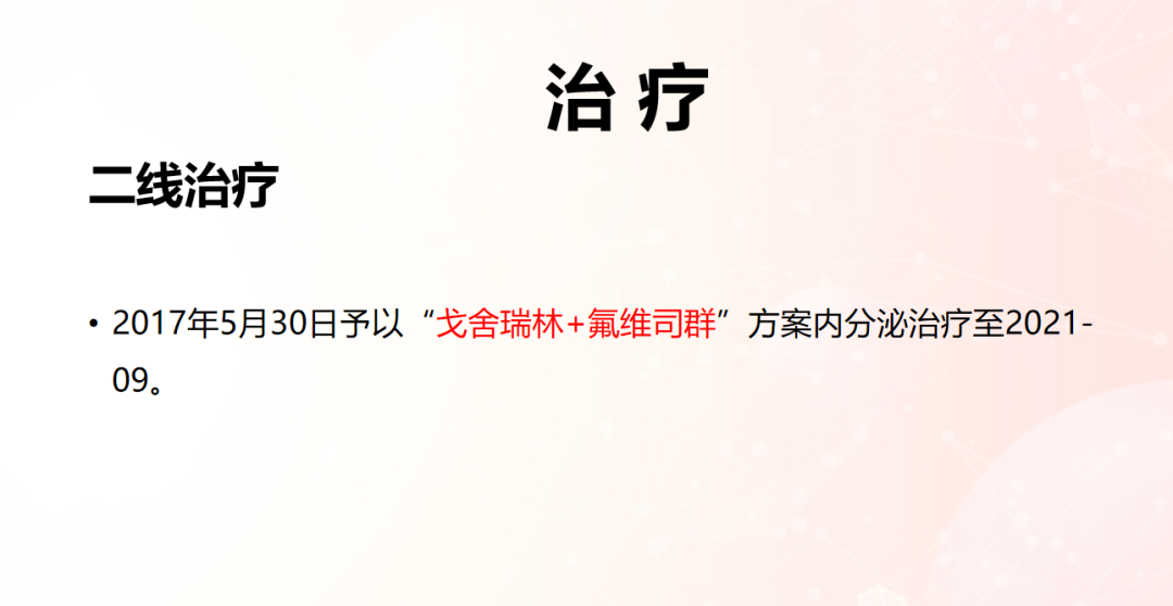 殷咏梅教授:该患者从2017年5月至2021年9月,使用“戈舍瑞林+氟维司群”方案,长达4年之久,也可以看出对于内分泌敏感的HR+晚期乳腺癌患者,临床中应该首选内分泌治疗。该患者晚期三线治疗如何选择?