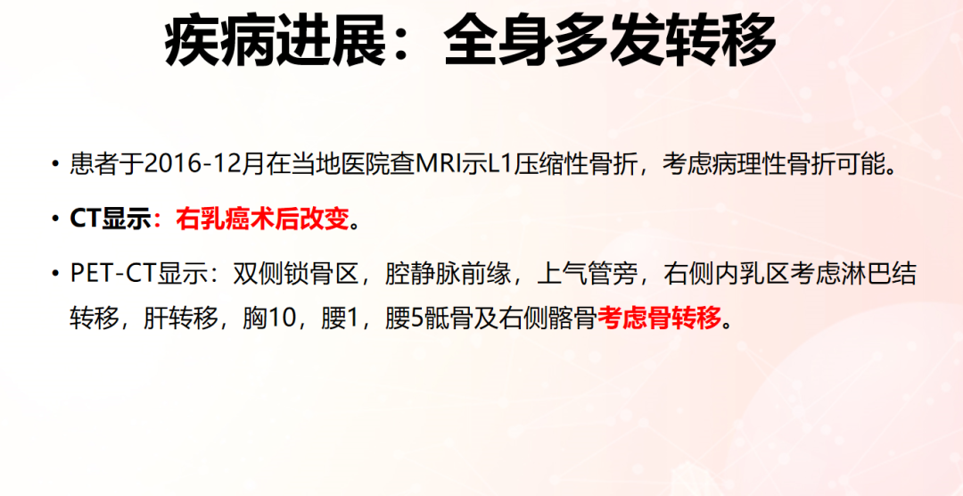 裴静教授:该患者出现了肝转移,但目前还没有非常明显的内脏危象,所以我还是考虑“内分泌+”的治疗方法,即选用OFS联合一个以前未用过的药物,如氟维司群,再联合CDK4/6抑制剂。