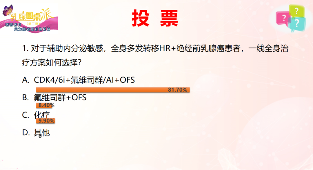 网上医生投票结果揭晓:绝大多数网上医生投票支持CDK4/6抑制剂+氟维司群/AI+OFS。