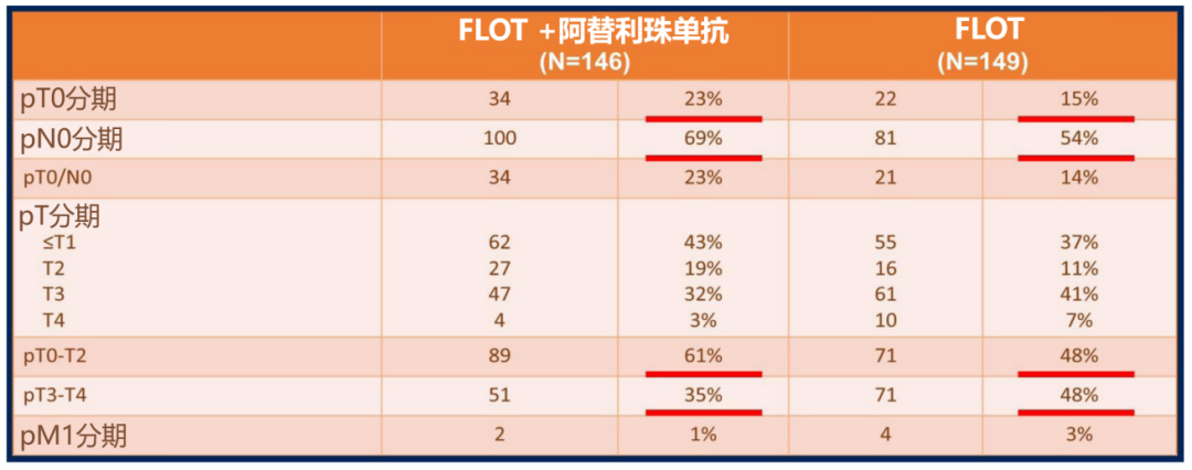 我们知道,基于FLOT4研究,FLOT化疗方案已经取代ECF方案,成为欧美国家胃癌新辅助治疗的新标准。在此基础上,DANTE研究进一步探讨免疫治疗联合FLOT用于(试验组:术前4个周期阿替利珠单抗+FLOT新辅助治疗,术后4个周期阿替利珠单抗+FLOT和4个周期阿替利珠单抗辅助治疗;对照组:术前、术后各4个周期FLOT)胃癌围术期治疗。这是目前胃癌围术期免疫治疗规模最大的研究,此次中期报告中免疫治疗组和FLOT组都有将近150例患者。