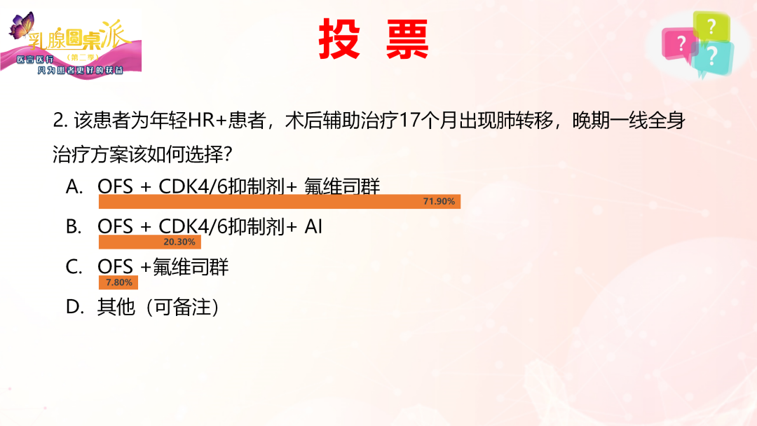 网上医生投票结果揭晓:绝大多数医生支持OFS+CDK4/6抑制剂+氟维司群,40.3%的医生支持OFS+CDK4/6抑制剂+AI。