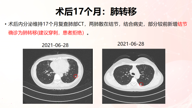 叶松青教授:对于出现复发转移的患者,我们应该尽可能获得其转移灶的病理活检结果。如果无法进行穿刺,也可以考虑通过液体检测来识别一些基因突变。虽然患者存在肺转移,我依然会首选内分泌联合靶向治疗,更换内分泌药物,即OFS+氟维司群+CDK4/6抑制剂。另外,这个患者的转移灶较小,能否进行穿刺活检,需要和专门进行穿刺的医生沟通确认;如果患者同意的情况下,我们可以在CT引导下行肺部穿刺活检。