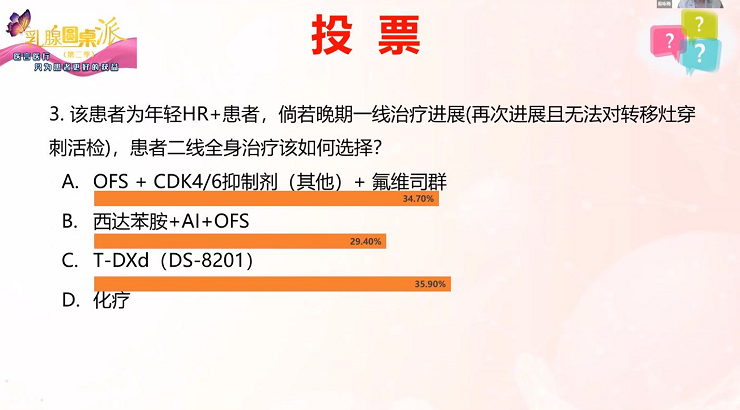 网上医生投票结果揭晓:34.7%的医生选择了OFS+CDK4/6抑制剂(其他)+氟维司群,有35.9%的医生选择了DS-8201,另外有29.4%的意思选择了西达苯胺。