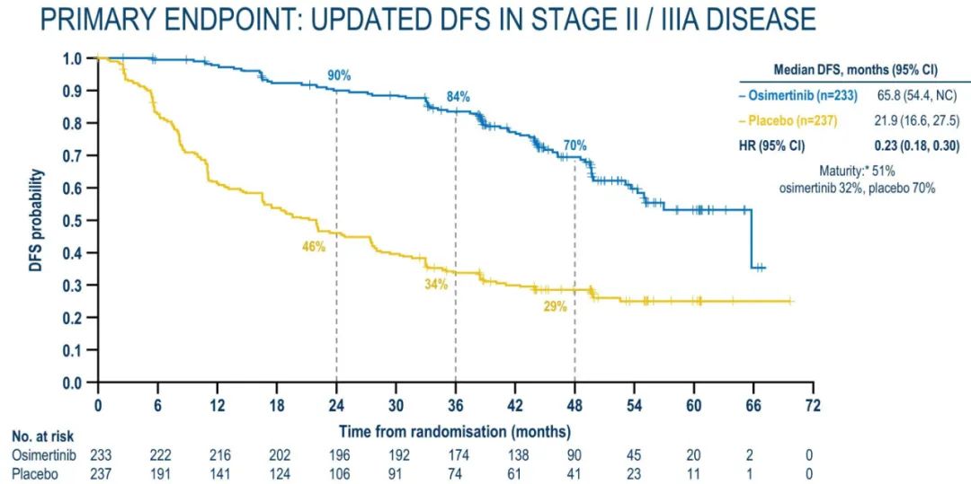 2022 ESMO报告了ADAURA试验延长随访两年后的结果。辅助奥希替尼将手术切除的EGFR突变阳性II-IIIA期NSCLC患者的疾病复发或死亡风险降低77%,并改善无病生存期(DFS),奥希替尼和安慰剂组的中位DFS分别为65.8个月vs 21.9个月(HR=0.23;95%CI:0.18-0.30)。研究结果促使一个问题被提出,即这种辅助靶向方案是否需要长期使用(摘要#LBA47)。