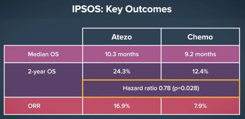 IPSOS试验将阿替利珠单抗vs单药化疗在因ECOG PS评分差(≥2)或年龄≥70岁伴有合并症等原因不适合一线标准含铂化疗的IIIB/IV期NSCLC患者中进行了比较。结果表明,阿替利珠单抗相比单药化疗具有OS获益,中位随访41.0个月后的中位OS分别为10.3个月和9.2个月,2年OS率分别为24.3%和12.4%(HR=0.78;95%CI:0.63-0.97;p=0.028)。阿替利珠单抗组和化疗组的ORR分别为16.9%和7.9%。免疫疗法可以用于这类通常被排除在试验之外的患者(摘要#LBA11)。