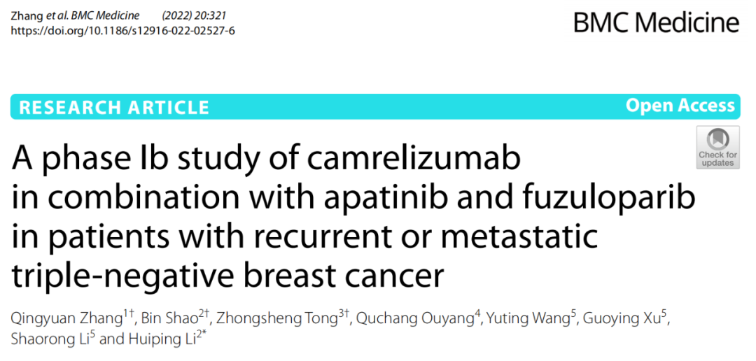 由北京大学肿瘤医院李惠平教授和哈尔滨医科大学附属肿瘤医院张清媛教授牵头开展的“卡瑞利珠单抗联合氟唑帕利和阿帕替尼治疗复发转移性三阴性乳腺癌的Ⅰb研究”于近期发表在BMC Medicine期刊上,晚期三阴性乳腺癌再次迎来了新的治疗组合。