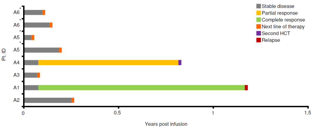 活动性疾病组纳入的8例患者均在移植后复发,且后续挽救治疗无效,该组患者既往中位治疗线数为5。输注前骨髓原始细胞比例的中位值为30%(30%-70%)。输注mLSTs时所有患者均存在可测量的白血病病灶。