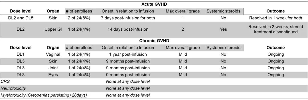 25例患者接受mLSTs输注48次,其中3例(12%)患者输注后新发急性GVHD或急性GVHD加重,4例(16%)患者新发慢性GVHD或慢性GVHD加重。仅1例患者发生上消化道2级GVHD,需要予激素全身治疗。最重要的是,所有患者均未出现细胞因子释放综合征(CRS)、神经毒性和长期(>28天)的骨髓毒性。肝炎(仅以ALT/AST上升定义)被认为是与治疗相关的不良事件,共6例患者发生肝炎,仅1例患者发生3级不良事件,需要予全身激素治疗,其他不良事件均≤2级且为自限性。本研究并未通过肝活检来确定或排除肝炎是否由非典型GVHD引起。