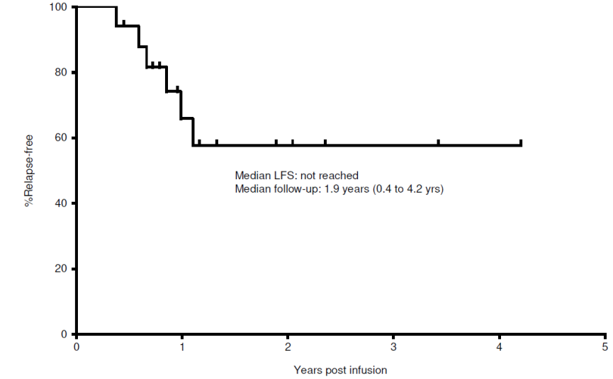 辅助治疗组患者在输注mLSTs时均为CR状态。中位随访1.9年,17例患者中有11例在mLST输注后未复发,中位无白血病生存(LFS)未达到(图3)。15例患者的总生存分析结果显示:11例存活,中位OS未达到,2年总生存率为77%,较未进行mLSTs输注的AML/MDS移植患者(经风险匹配后)的预后(中位LFS为9-15个月,2年生存率为42%)更有优势。