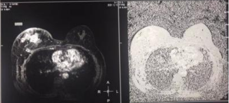 2021年12月10日,乳腺核磁影像表现:左乳明显变形,其内可见多发结节及肿块影,大小不等。最大者约6.3×4.8×5.1cm。形态不规则,信号不均匀,边缘可见分页周围腺体结构紊乱。累计临近皮肤,皮肤明显不规则增厚。