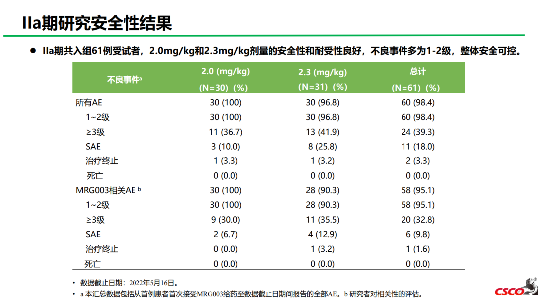 在MRG003-005研究的Ⅱa期疗效探索阶段,截止2022年6月8日,共入组了61例中国患者,其中MRG003 2.0mg/kg组30例,2.3mg/kg组31例,EGOG 0-1分,既往系统中位治疗线数为2线,均接受过含铂+PD-1方案,约90%的患者接受过放疗。研究结果显示:在有效性分析集的57例受试者中,总体ORR为47.4%,DCR为79.0%,3个月DoR率为90%;其中2.0mg/kg剂量组28例,ORR为39.3%,DCR为71.4%,2.3g/kg剂量组29例,ORR为55.2%,DCR为86.2%;2.0mg/kg剂量组mPFS为6.3个月,3个月PFS率为62.3%;2.3mg/kg剂量组mPFS未成熟,3个月PFS率为88.7%。亚组分析显示,96.5%的受试者EGFR表达量为1+及以上,无论肿瘤组织EGFR表达量高低,MRG003均取得了良好的疗效。