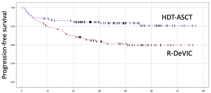 中位随访44个月,结果显示:①共有69%(239/346)的患者在诱导治疗后出现缓解,其中完全缓解率(CR)为27%,部分缓解率(PR)则为52%,两组巩固治疗均耐受性良好,分别有100(87%)和111(97%)例患者完成R-DeVIC和HDC-ASCT治疗。②在生存方面,大剂量化疗+自体干细胞移植组(HDC-ASCT)要明显优于R-DeVIC方案组,3年PFS分别为79%vs53%(HR=0.42;P=0.0003),3年OS则分别为86%vs71%(HR=0.47;P=0.01)。③安全性方面,6例患者巩固治疗期间死于毒性(A组2例,B组4例),6例患者死于非相关原因(A组5例,B组1例),二组的神经认知功能无差异。另外,有13例(3.8%)患者在诱导治疗期间死于治疗相关并发症,其中11例死于中性粒细胞减少性感染。