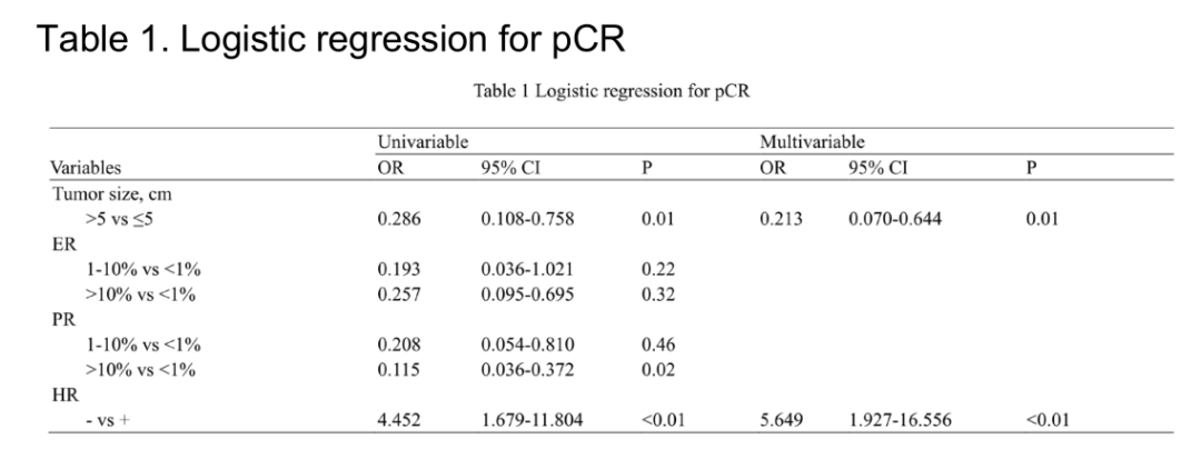 本研究共纳入85例患者,其中55例(64.71%)患者在新辅助治疗后达到pCR。术前根据RECIST 1.1评价标准,部分缓解(PR)84例(98.82%),病情稳定(SD)1例(1.18%)。根据单变量分析,与肿瘤直径≤5 cm的患者相比,基线肿瘤直径>5 cm的患者pCR率较低(比值比[OR]=0.286,95%CI,0.108-0.758,P=0.01)。术前PR>10%阳性患者pCR率低于术前PR<1%阳性患者(OR=0.115,95%CI,0.036-0.372,P=0.02)。此外,术前激素受体(HR)阴性患者pCR比术前HR阳性(ER或PR>10%阳性)患者更常见(OR=4.452,95%CI,1.679-11.804,P<0.01)。多变量分析显示,肿瘤直径>5 cm的患者pCR率低于肿瘤直径≤5 cm的患者(OR=0.213,95%CI,0.070-0.644,P=0.01)。术前HR阴性患者比术前HR阳性患者更容易达到pCR(OR=5.649,95%CI,1.927-16.556,P<0.01)(表1)。患者对治疗的耐受性良好,未见其他不良事件报道。