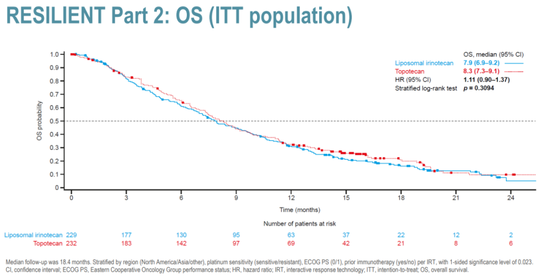 中位随访时间为18.2个月,在意向治疗(ITT)人群中,伊立替康组(n=229)的中位OS为7.9个月(95%CI:6.9-9.2),而拓扑替康组(n=232)的中位OS为8.3个月(95%CI:7.3-9.1)(HR=1.11;95%CI:0.90-1.37;分层时序检验,P=0.3094),未达到研究的主要终点。